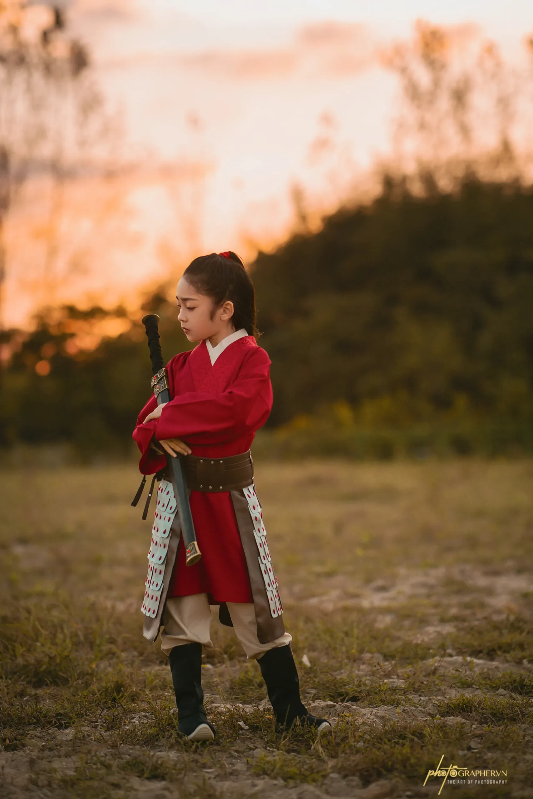 Cổ trang – bé gái – đỏ – hoàng hôn – ngoài trời – kiếm – ngựa – lửa – CTN002