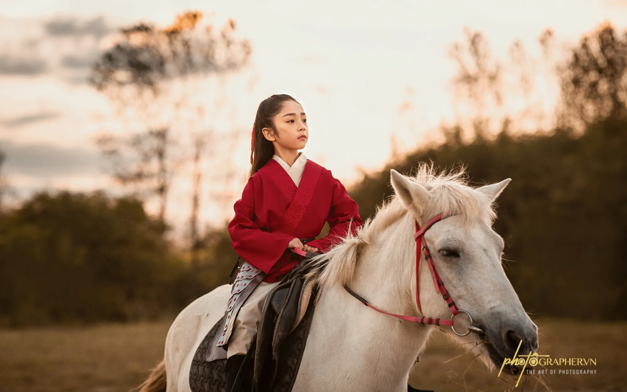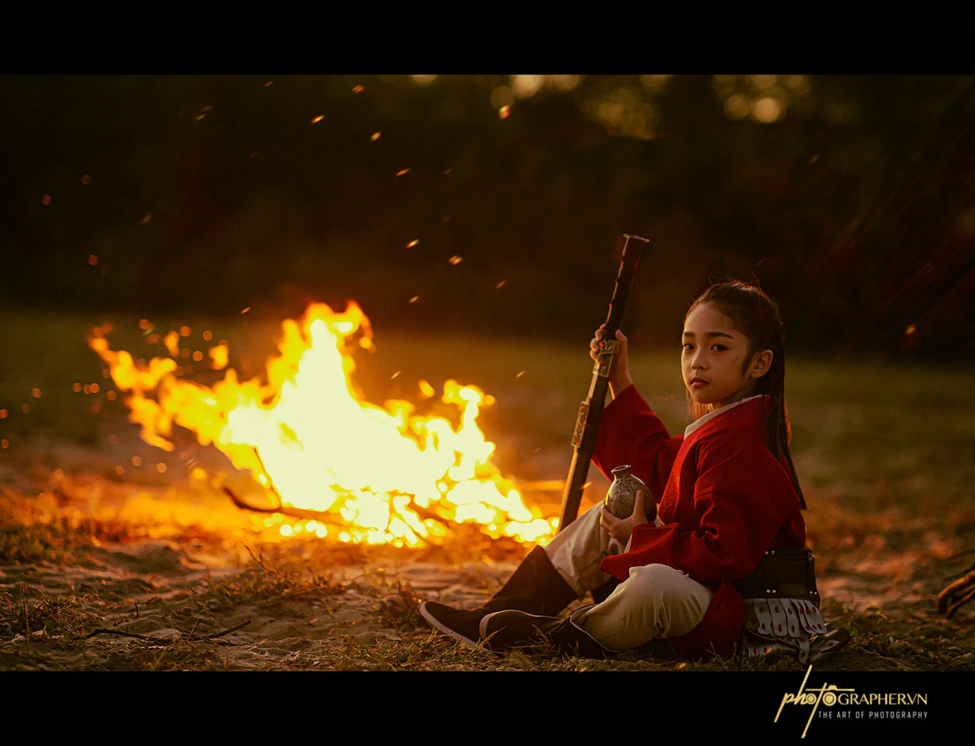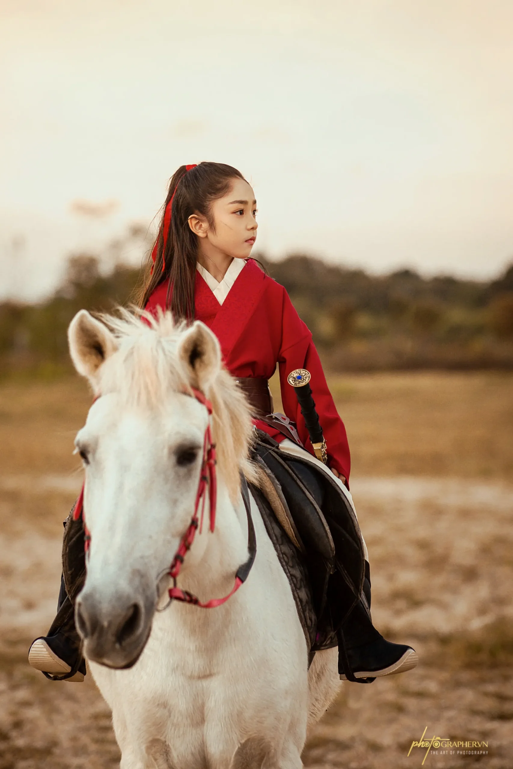 Cổ trang – bé gái – đỏ – hoàng hôn – ngoài trời – kiếm – ngựa – lửa – CTN002