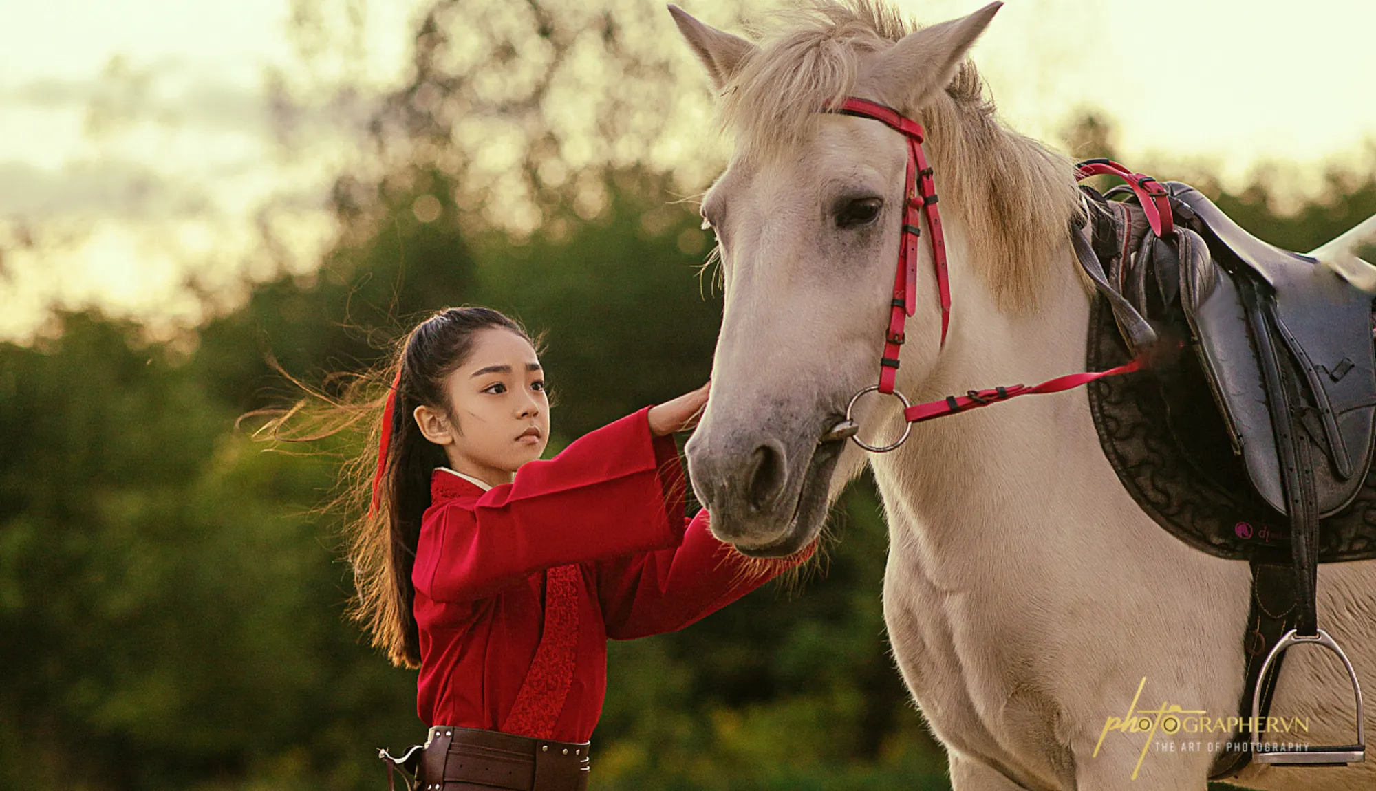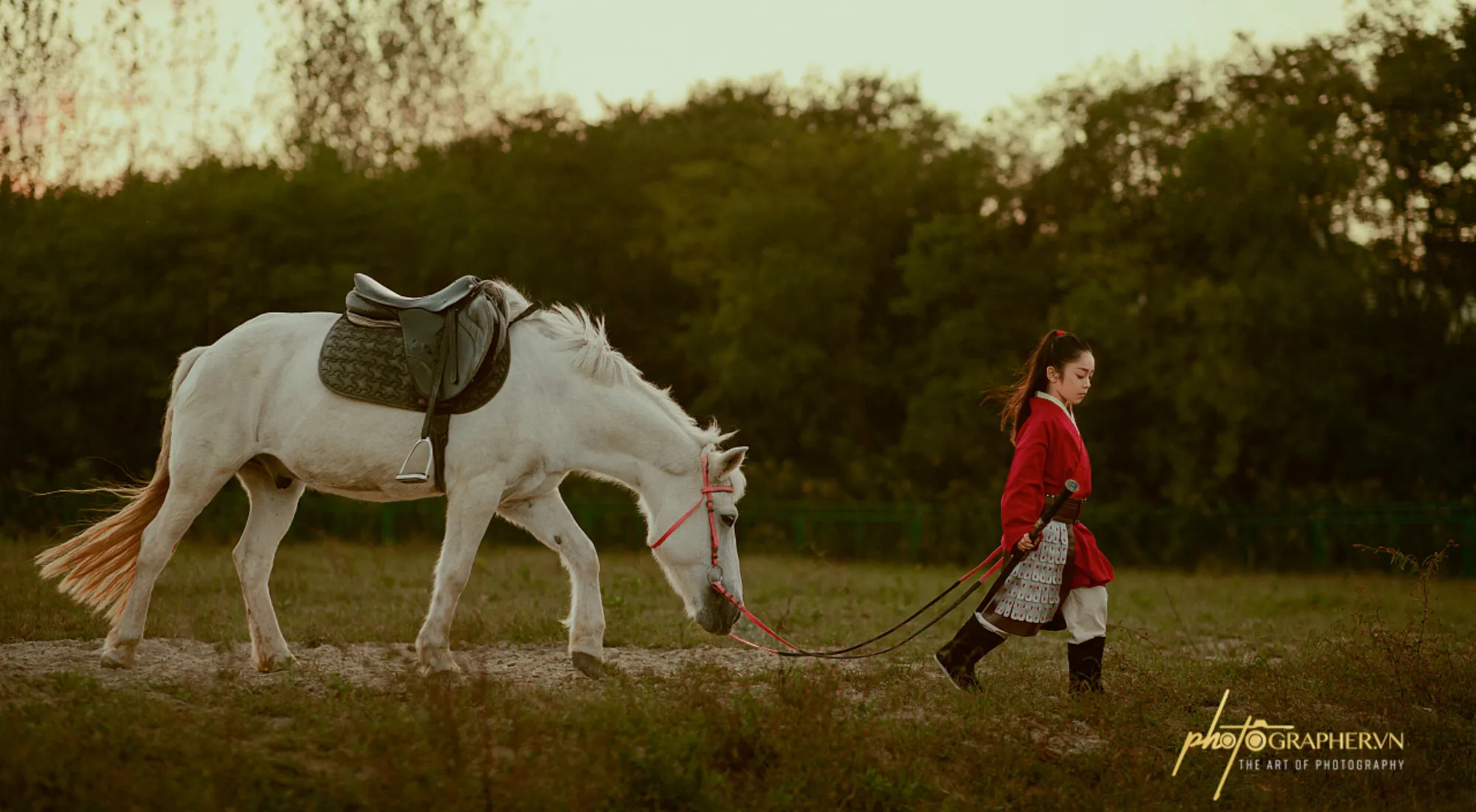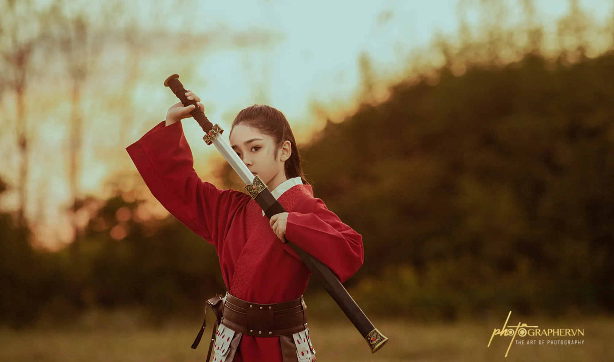 Cổ trang – bé gái – đỏ – hoàng hôn – ngoài trời – kiếm – ngựa – lửa – CTN002