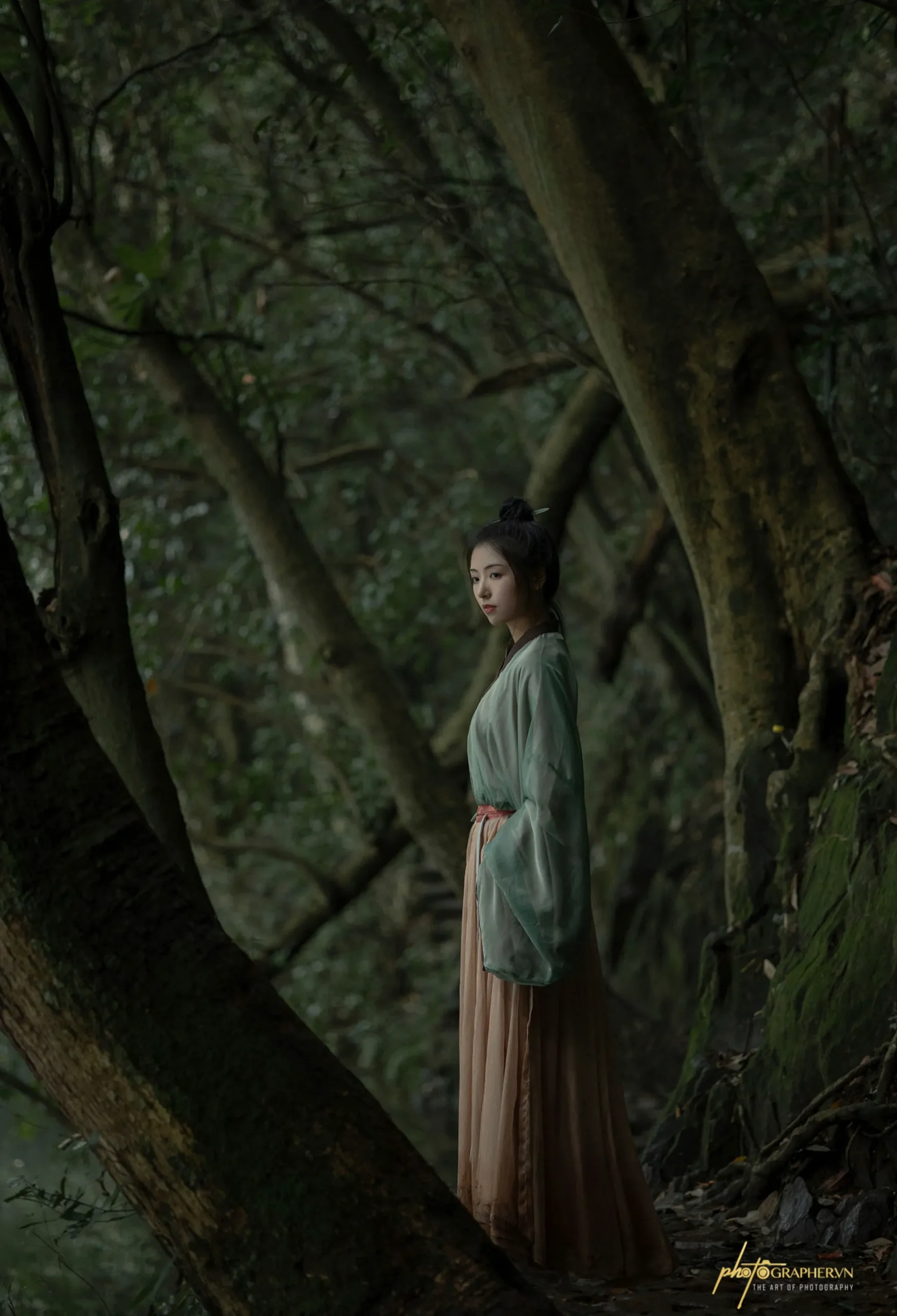 Cổ trang – nữ – xanh lá – trầm lắng – ngoài trời – rừng cây – lồng đèn – ô – CTN001