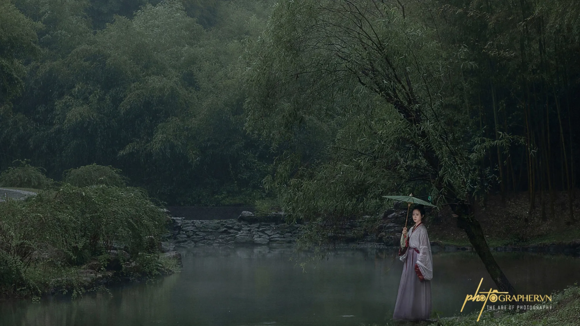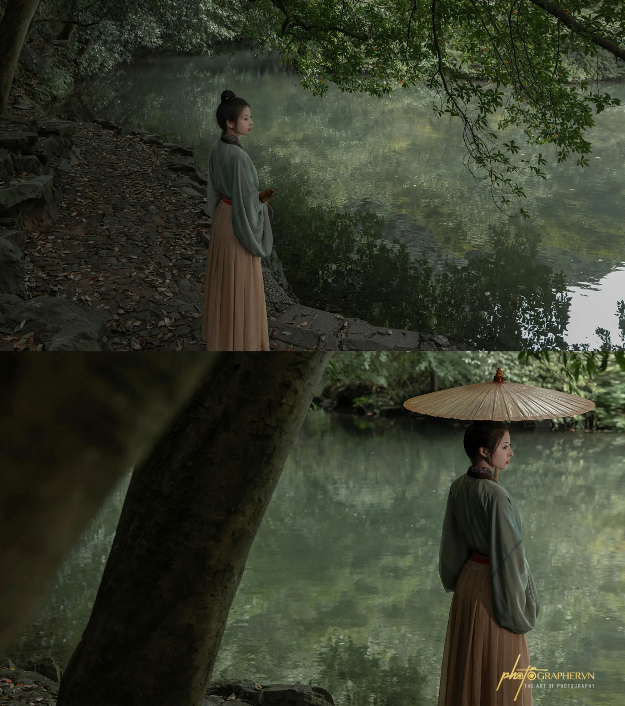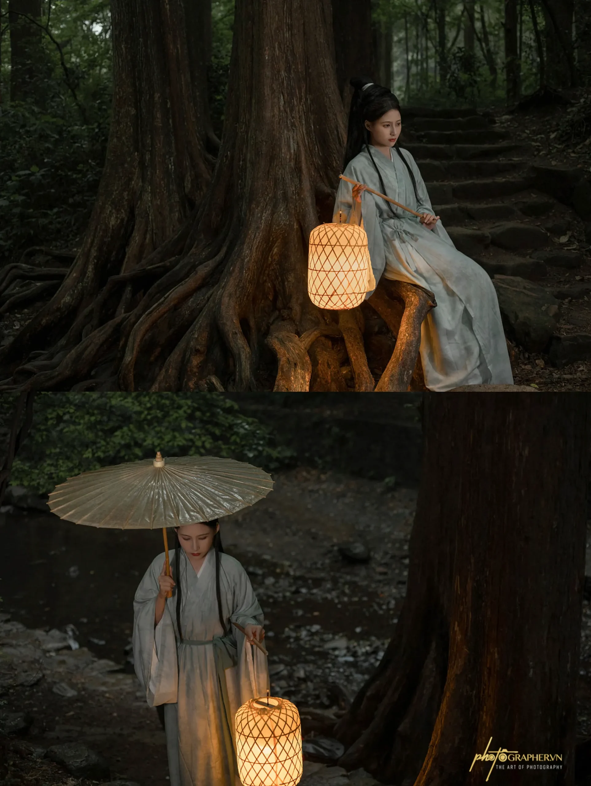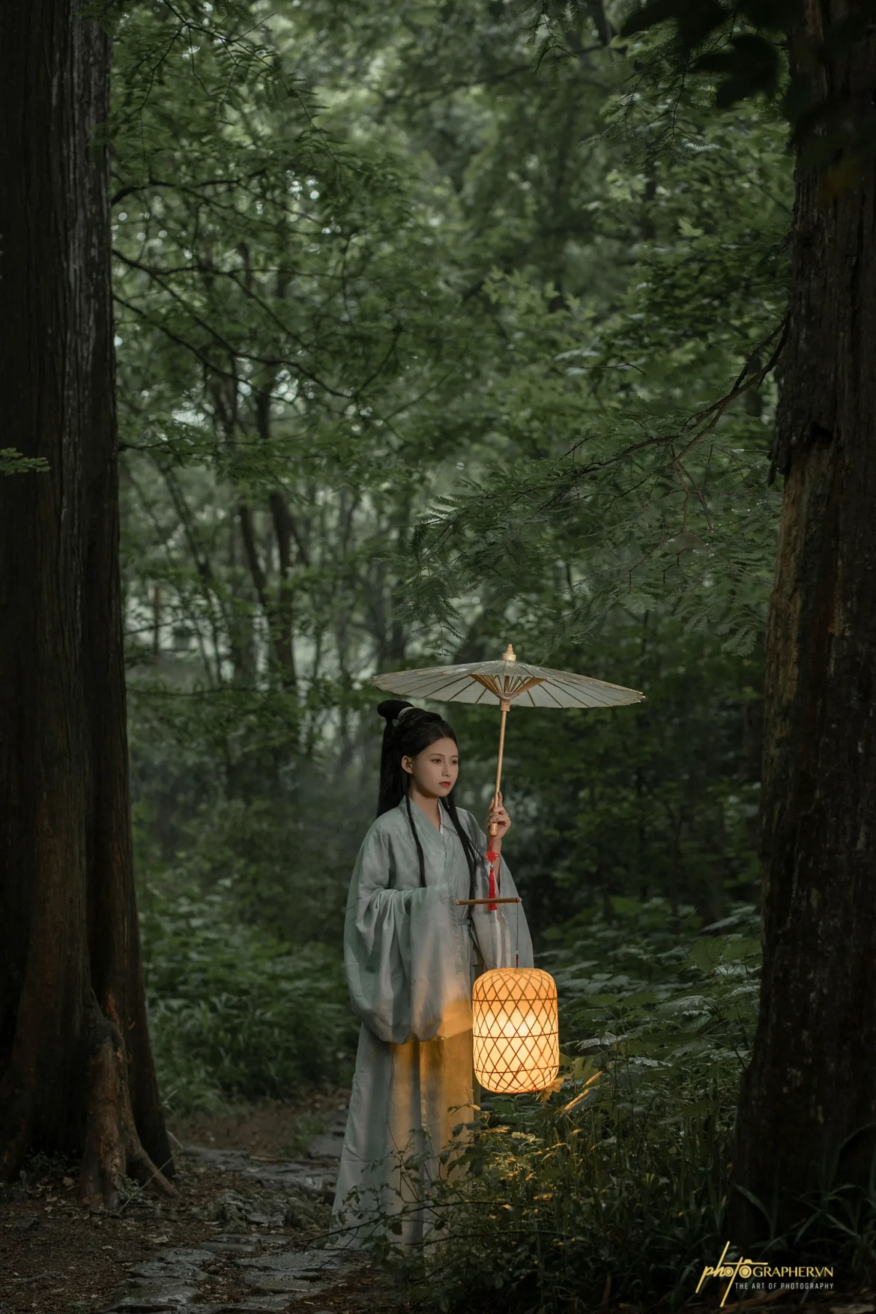 Cổ trang – nữ – xanh lá – trầm lắng – ngoài trời – rừng cây – lồng đèn – ô – CTN001