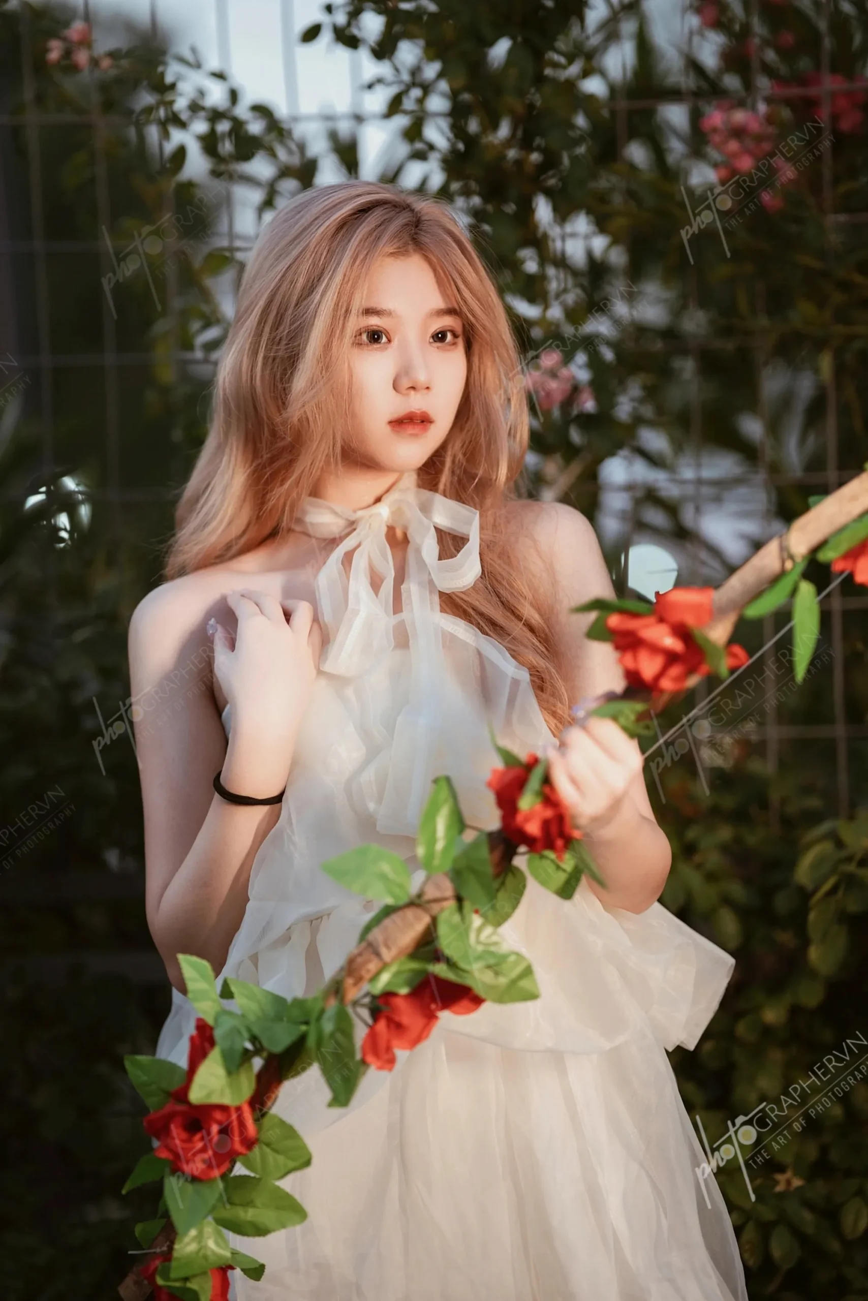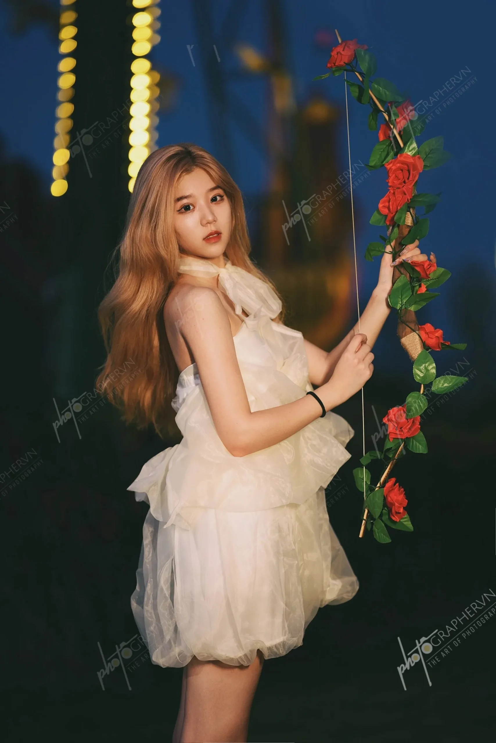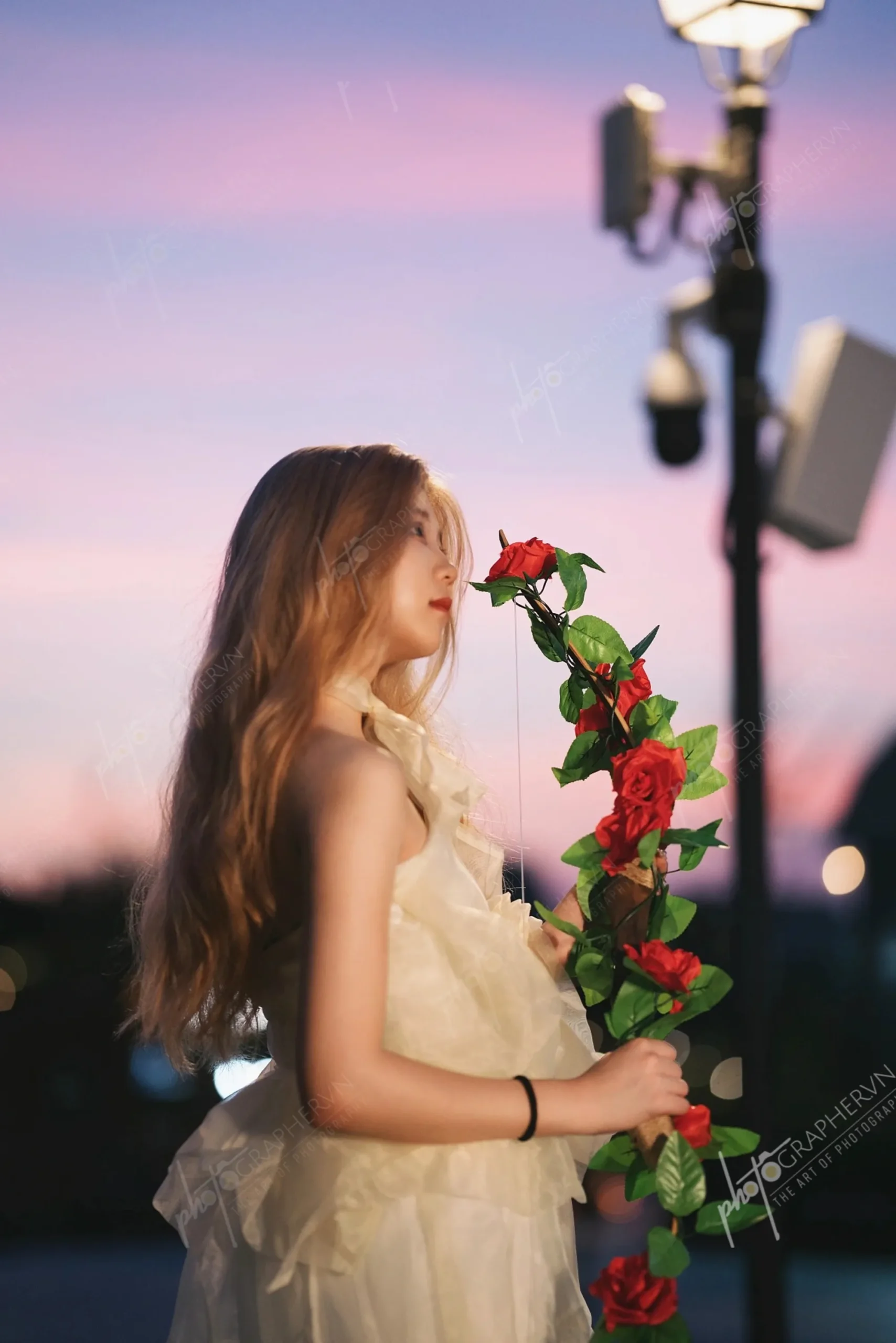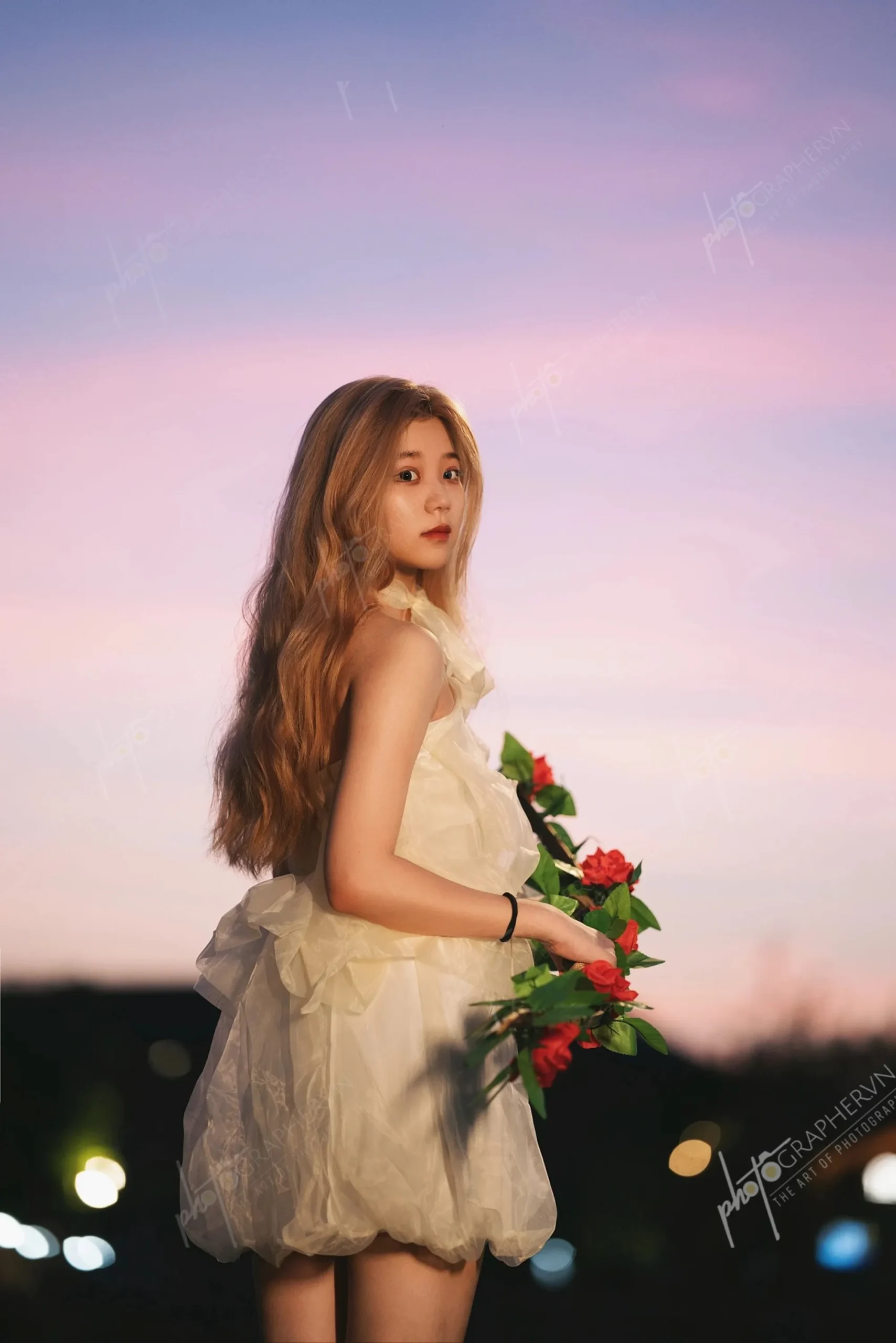 Dã ngoại – nữ – trắng – tím hồng – tiểu thư – ngoài trời – chiều tối – hoa hồng – DNGOLD003