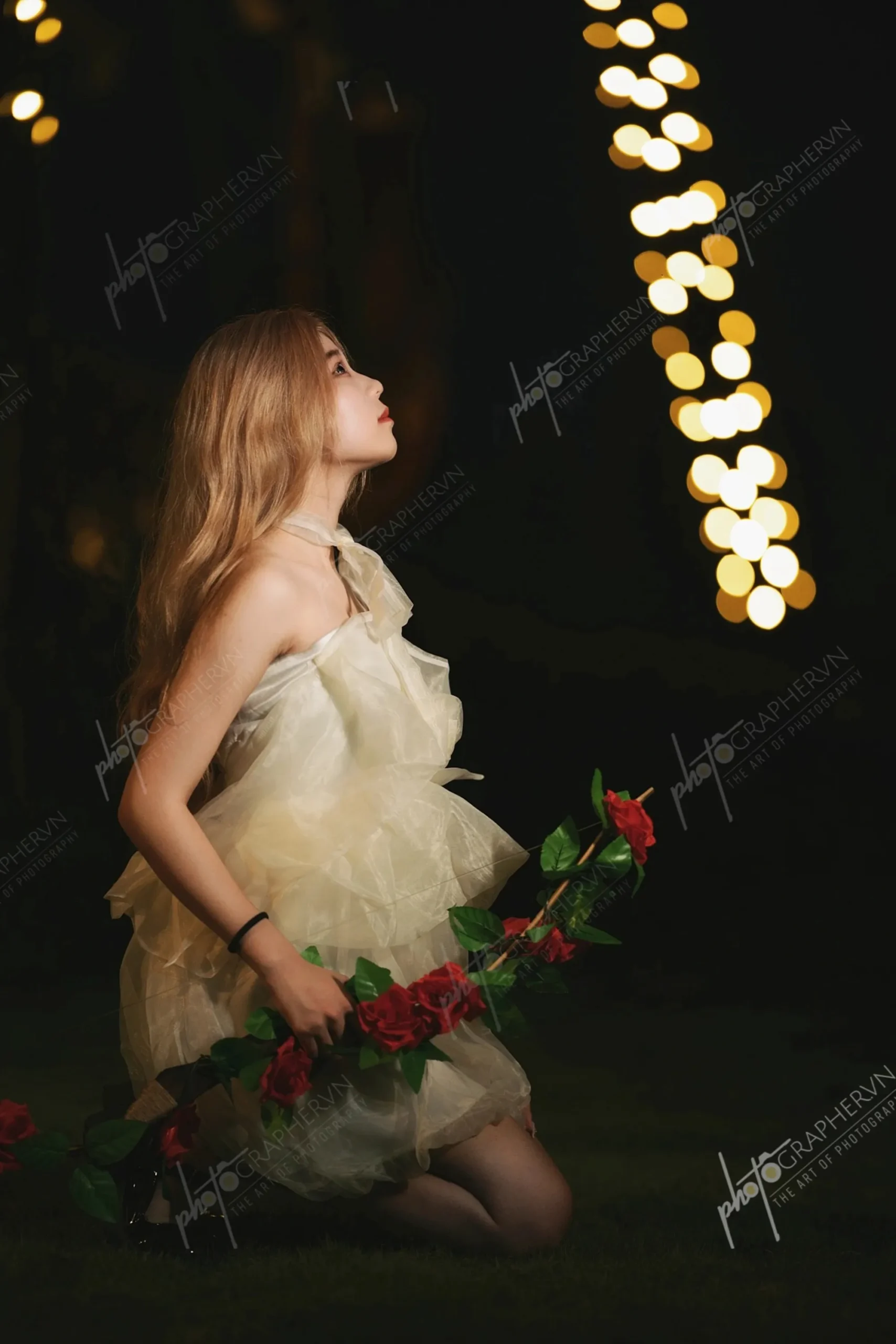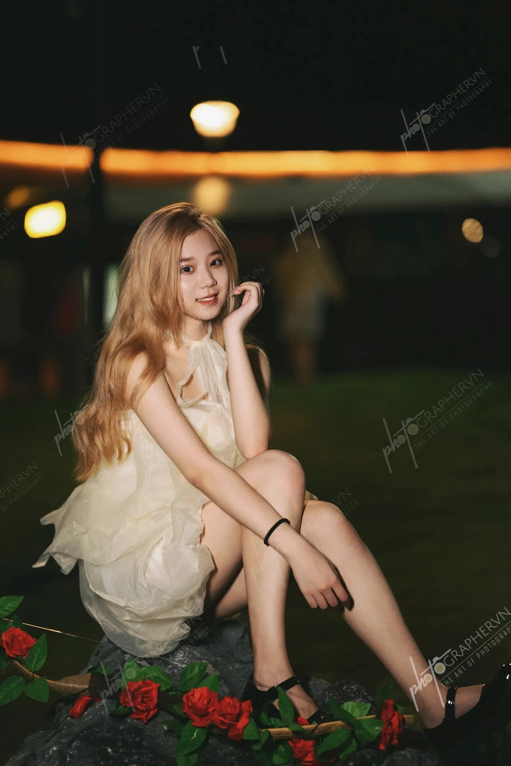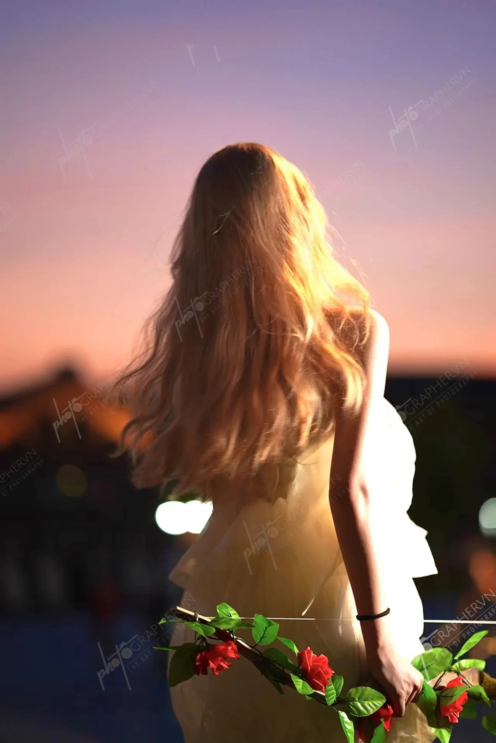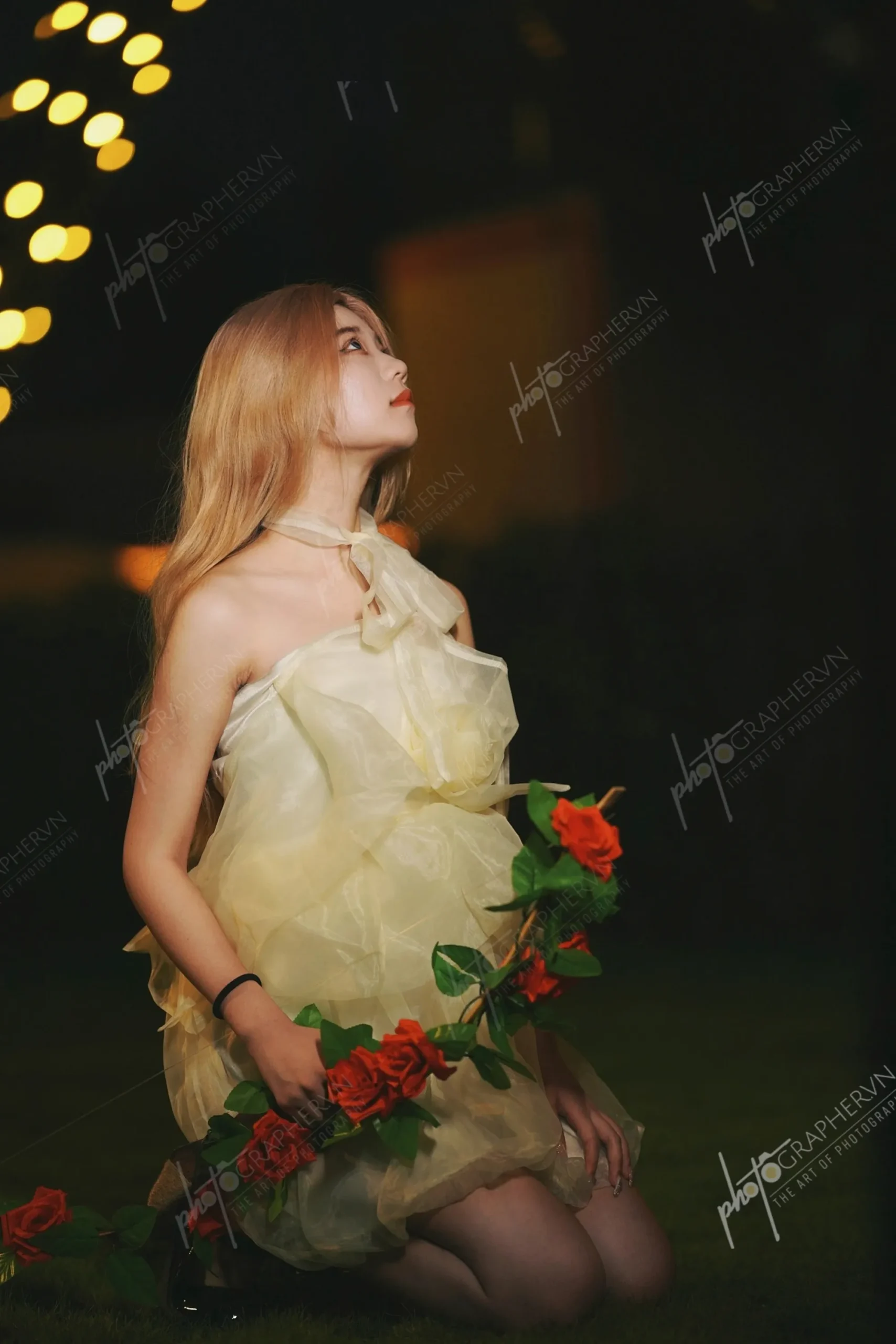 Dã ngoại – nữ – trắng – tím hồng – tiểu thư – ngoài trời – chiều tối – hoa hồng – DNGOLD003