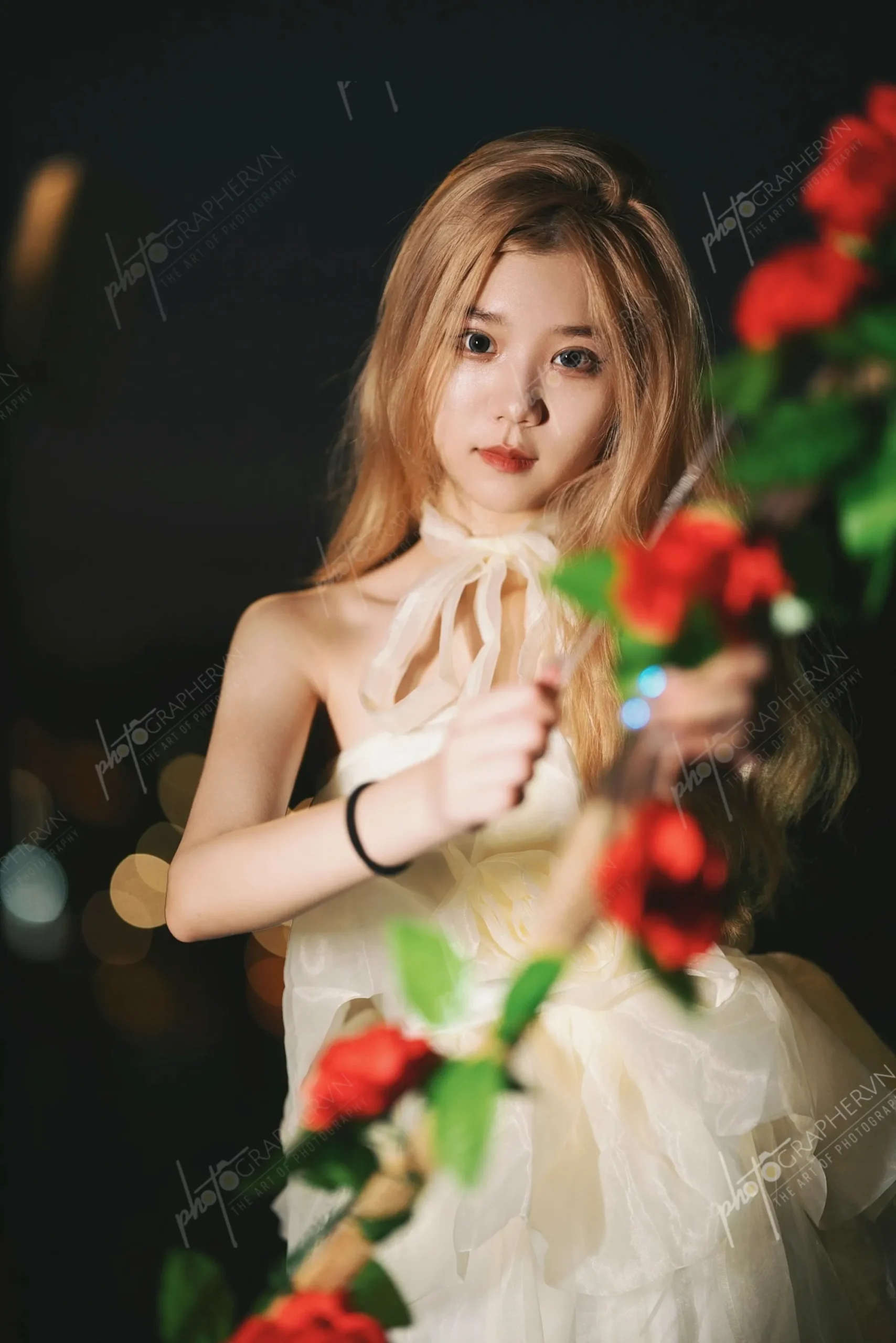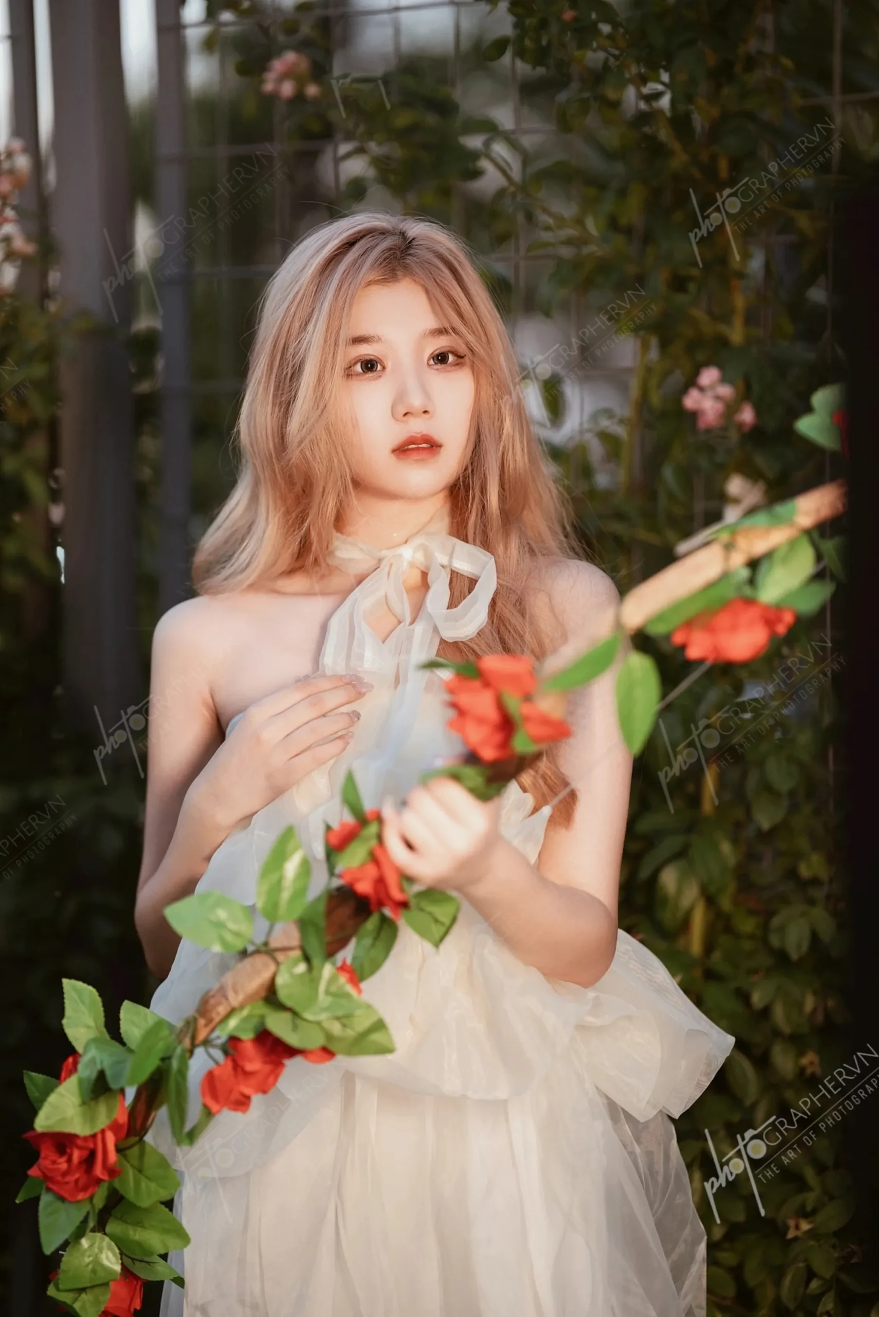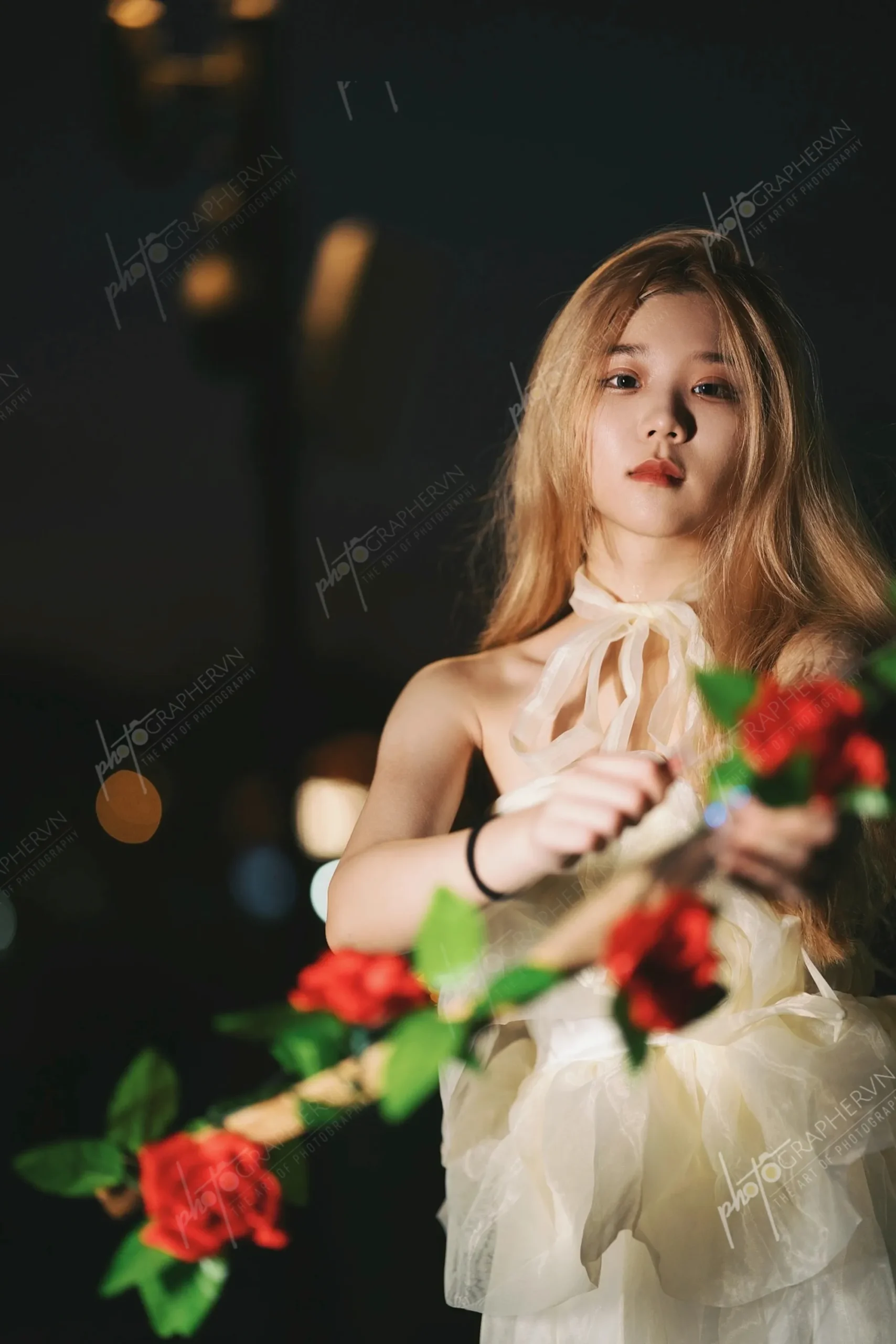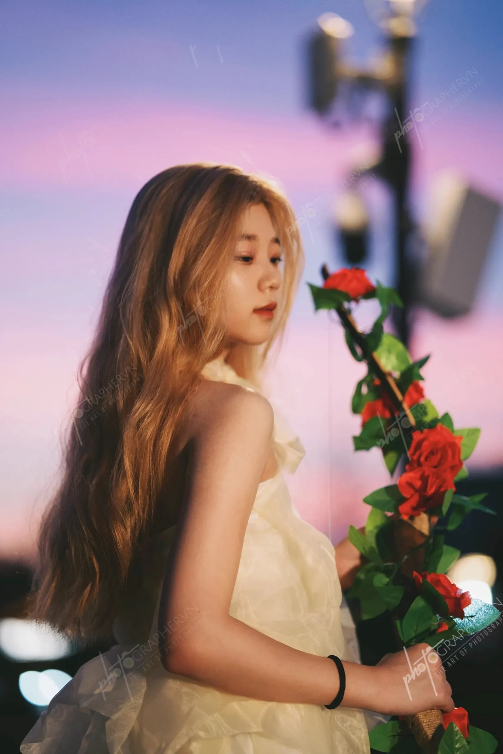 Dã ngoại – nữ – trắng – tím hồng – tiểu thư – ngoài trời – chiều tối – hoa hồng – DNGOLD003