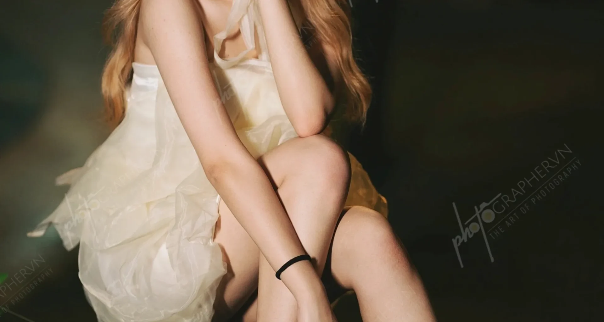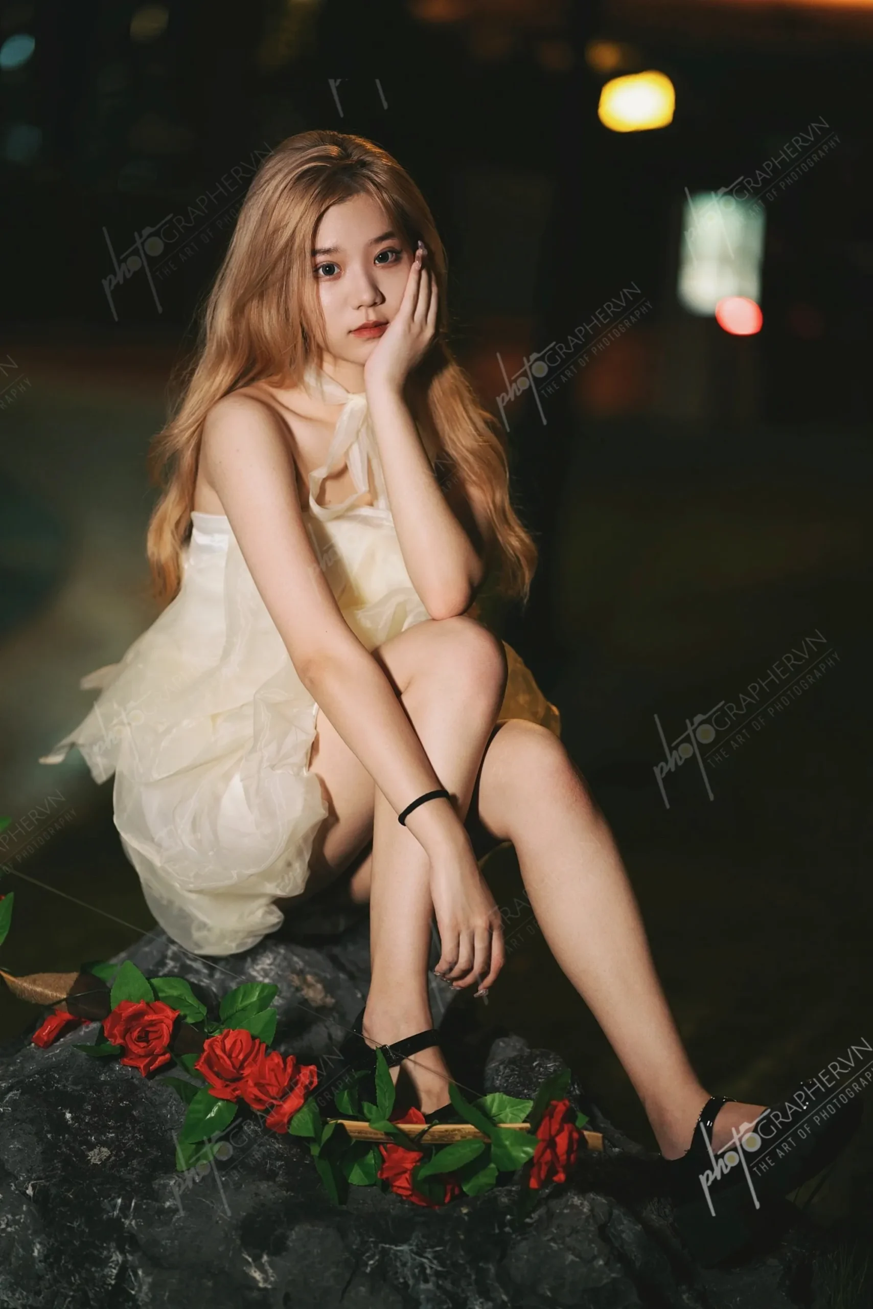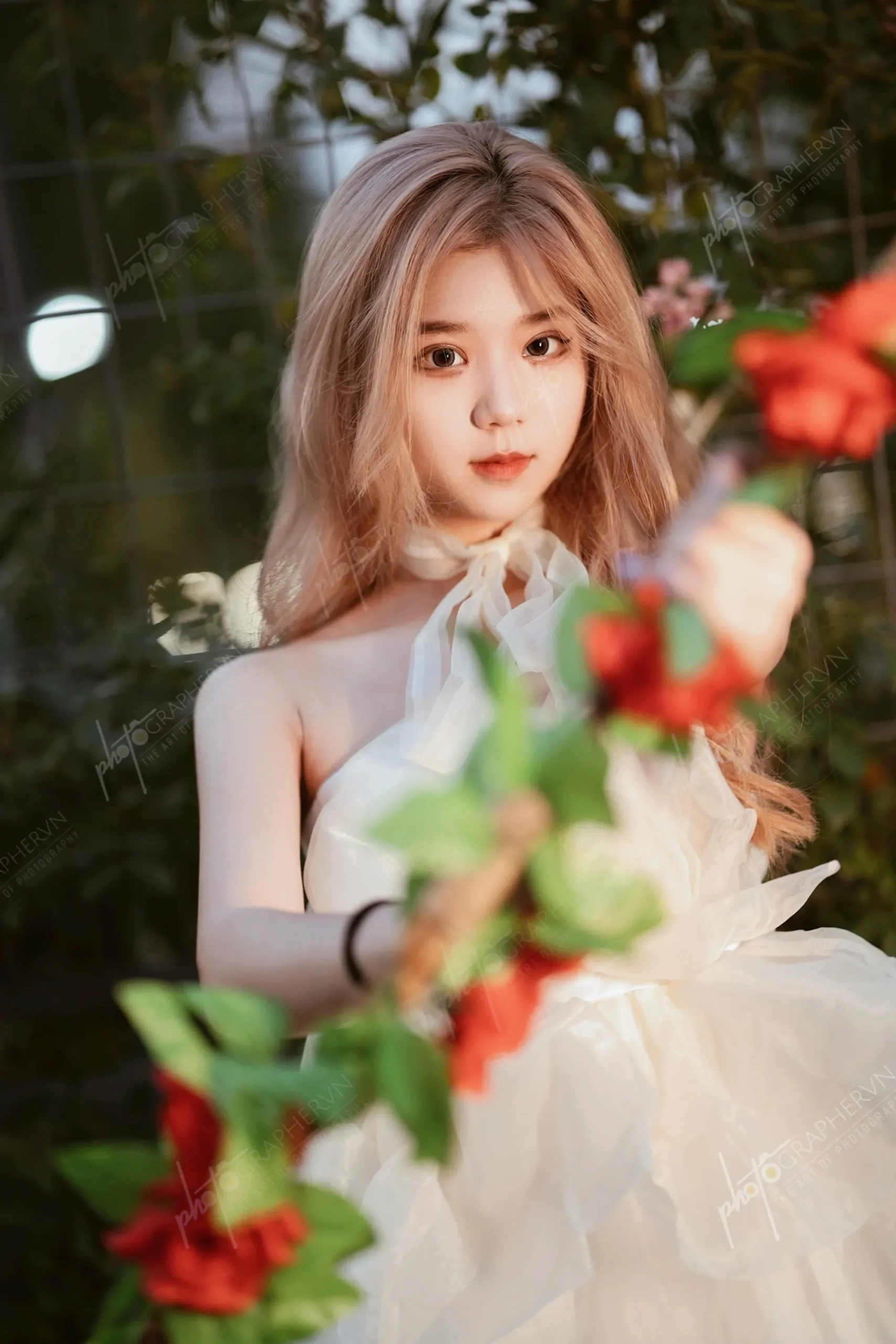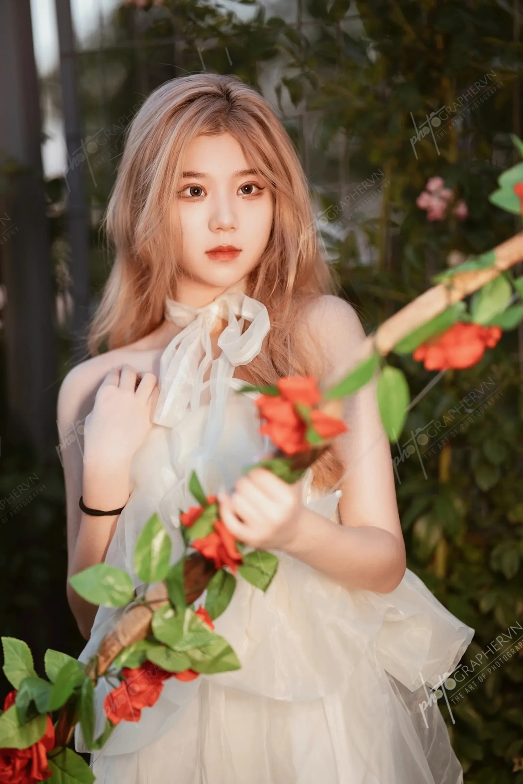 Dã ngoại – nữ – trắng – tím hồng – tiểu thư – ngoài trời – chiều tối – hoa hồng – DNGOLD003