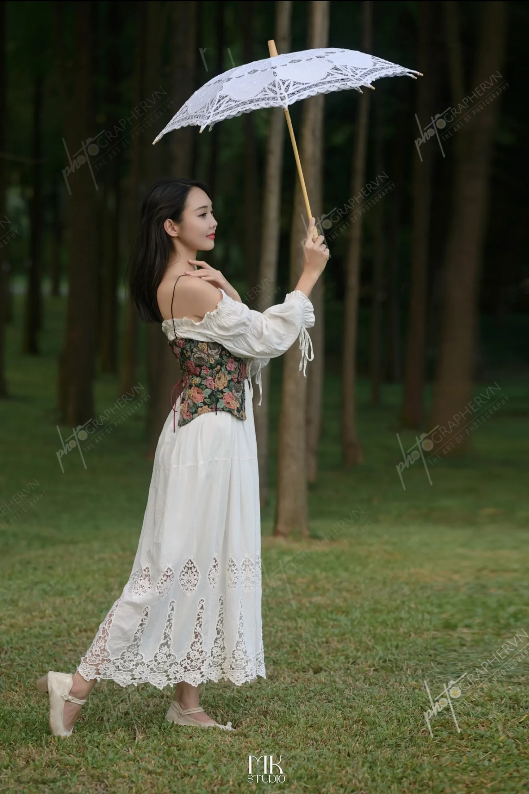 Dã ngoại – nữ – trắng – xanh – nhẹ nhàng – ngoài trời – hoa cỏ – sách – ô – DNBASIC001