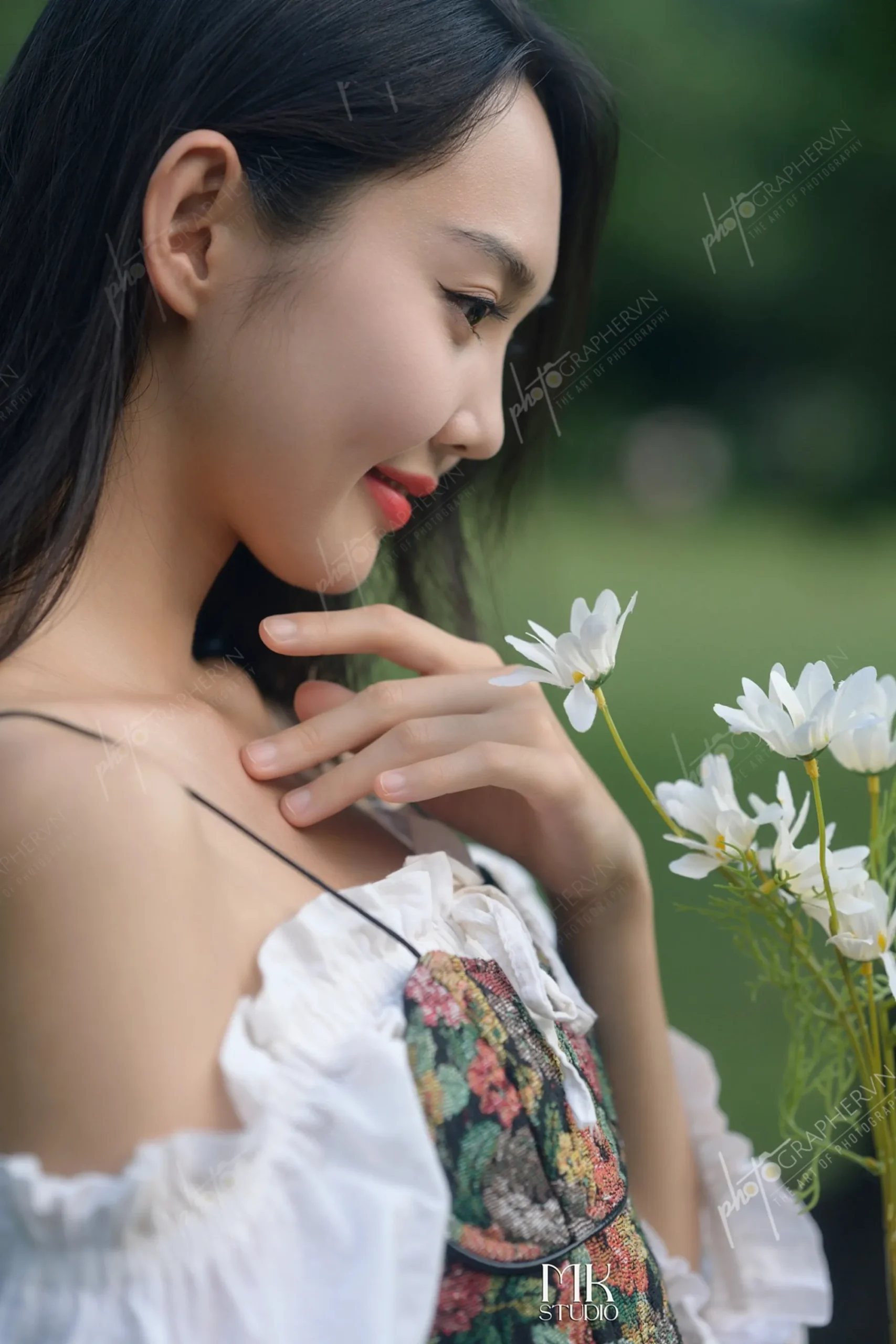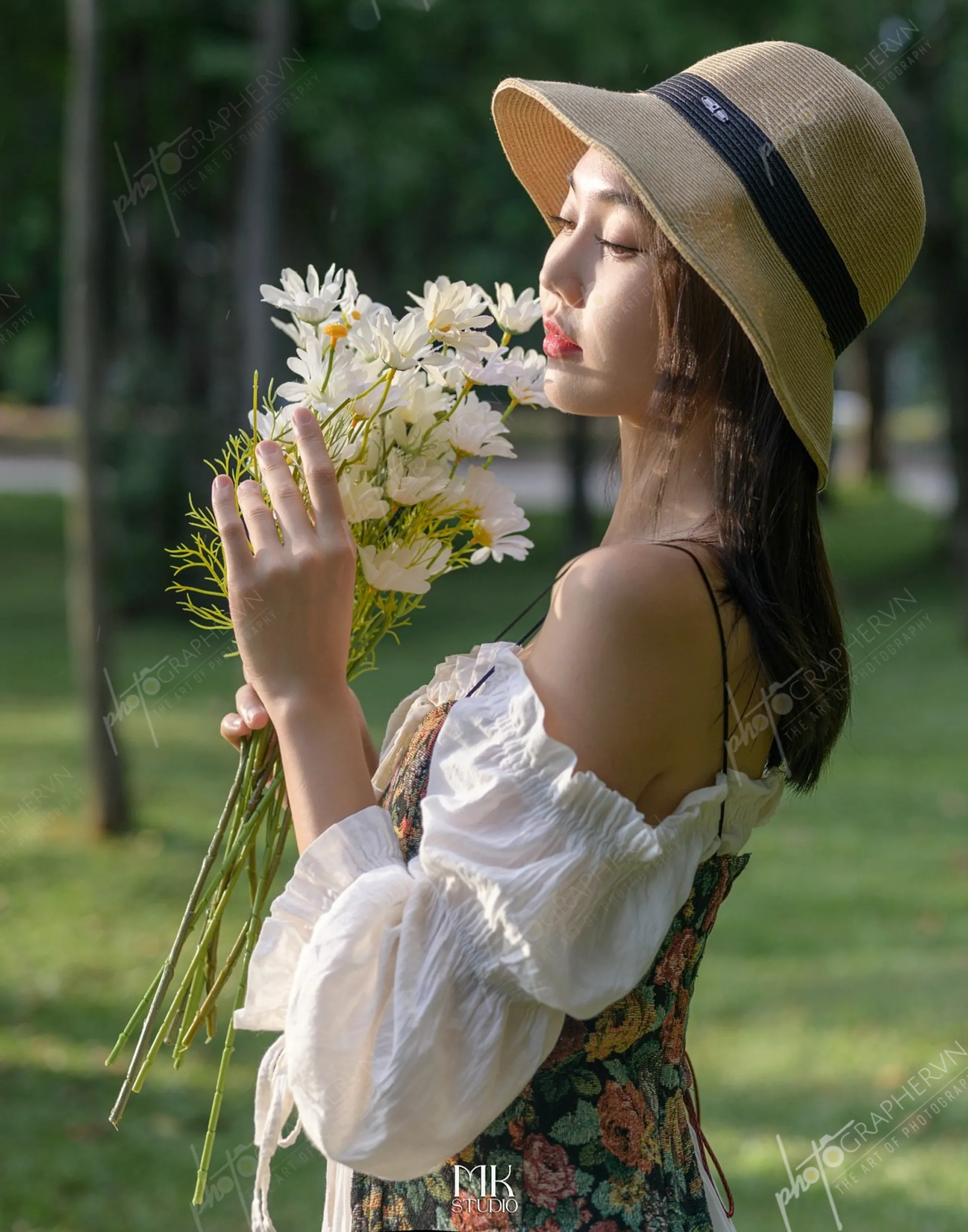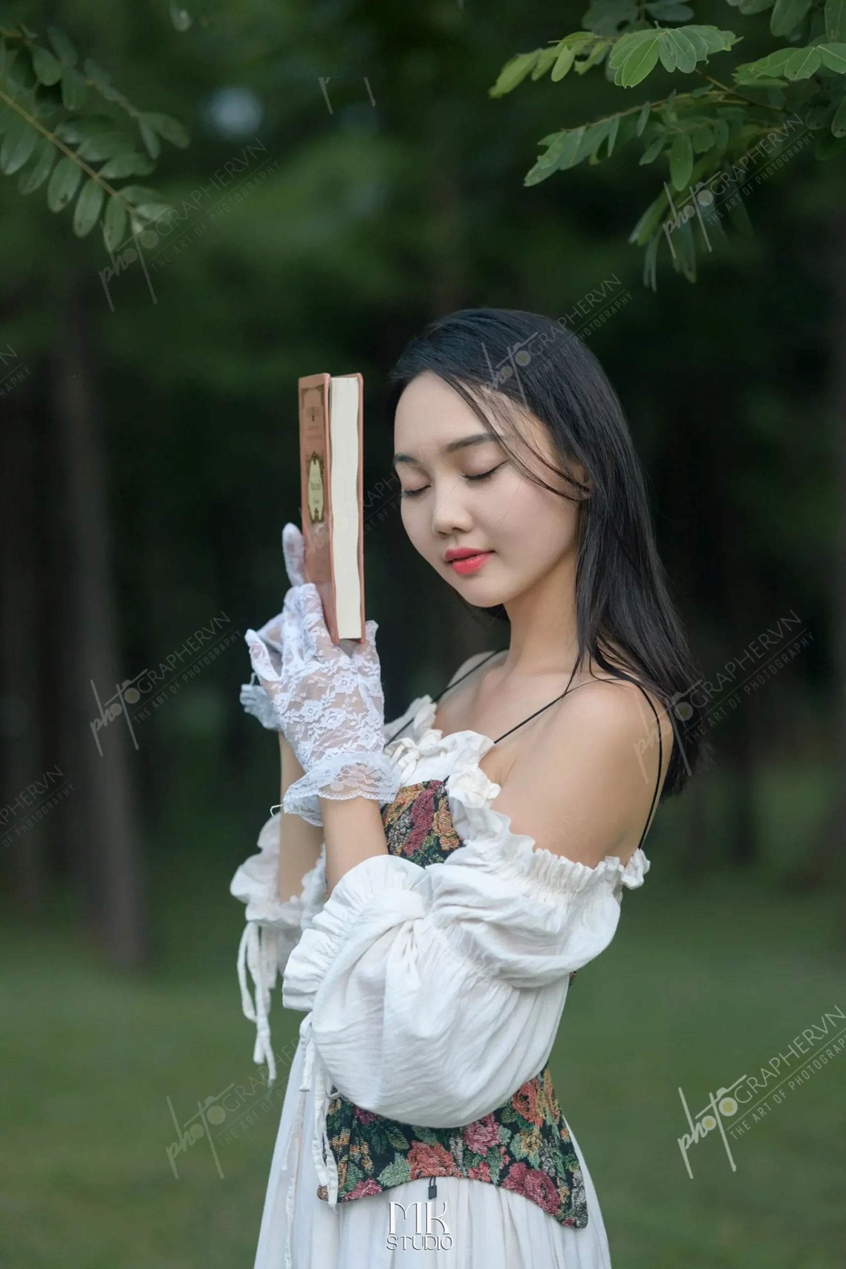Dã ngoại – nữ – trắng – xanh – nhẹ nhàng – ngoài trời – hoa cỏ – sách – ô – DNBASIC001