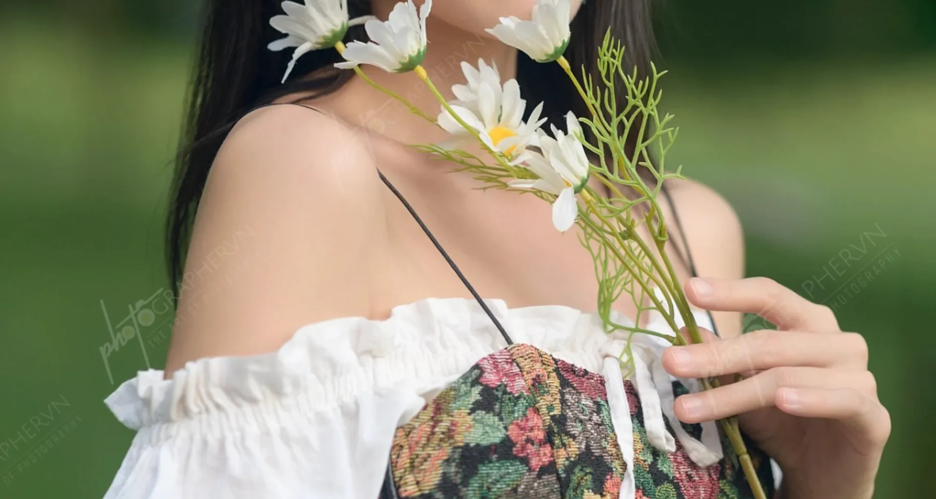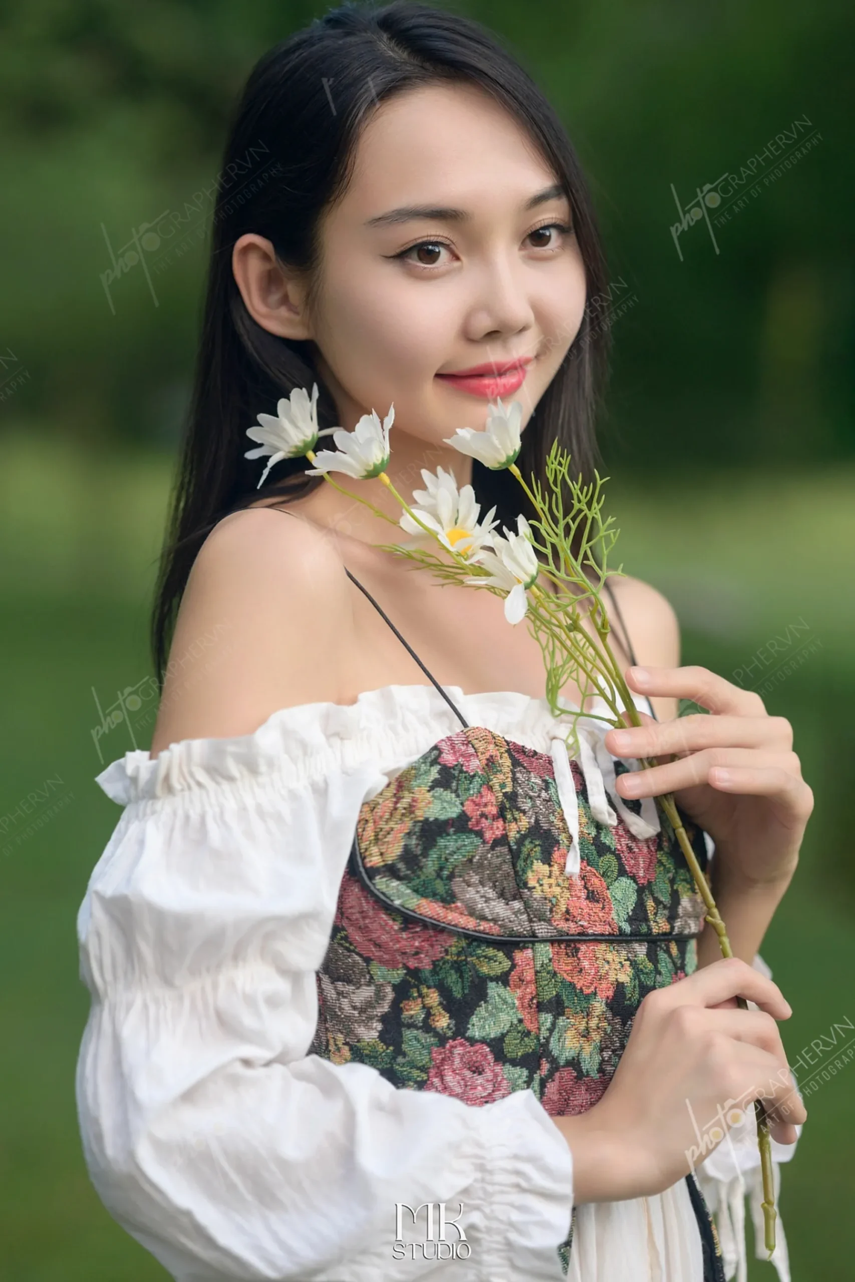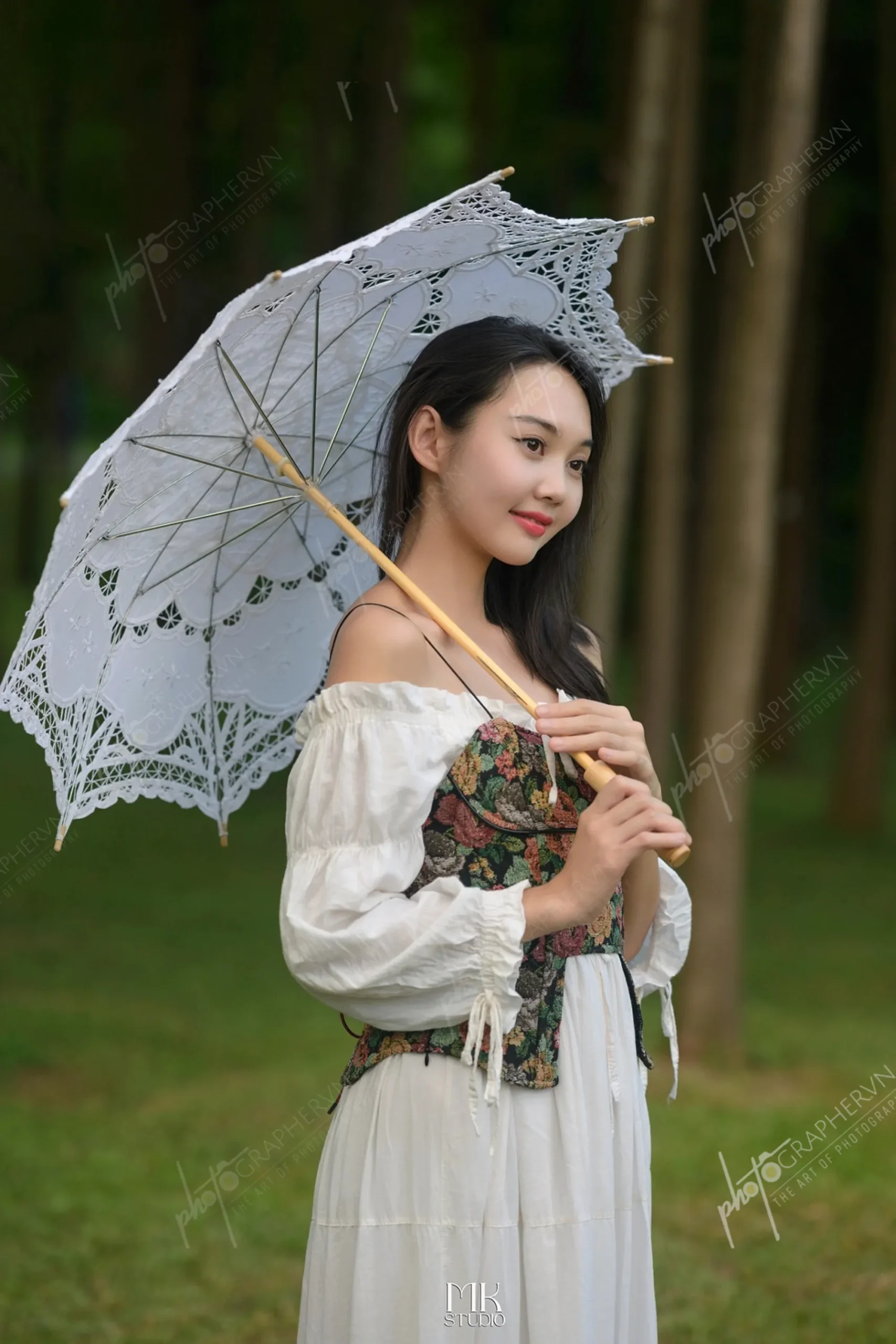 Dã ngoại – nữ – trắng – xanh – nhẹ nhàng – ngoài trời – hoa cỏ – sách – ô – DNBASIC001